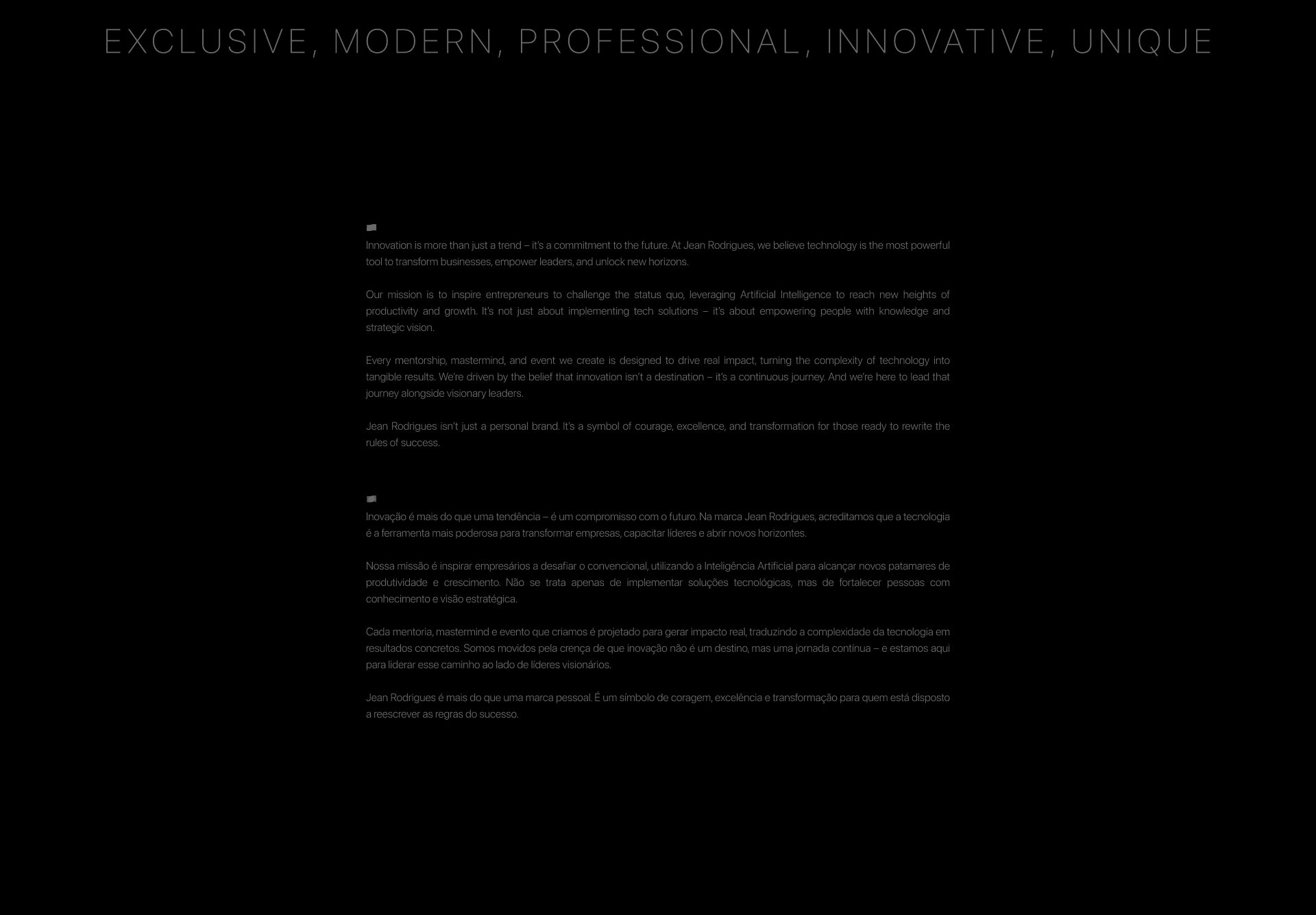 Jean Rodrigues é mais do que uma marca pessoal. Ele representa um movimento de inovação, tecnologia e transformação para líderes e empresários que querem explorar o poder da Inteligência Artificial. O desafio era desenvolver uma identidade visual que refletisse modernidade, sofisticação e autoridade, sem perder a conexão humana e estratégica da marca. Além de criar um visual impactante, era essencial que a identidade transmitisse exclusividade, visão de futuro e um posicionamento diferenciado no mercado.